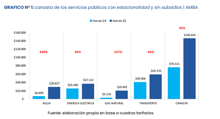 Los datos del IIEP señalaron que los aumentos interanuales fueron desiguales entre los diferentes servicios. El gas natural experimentó el mayor incremento, con un aumento del 537% en comparación con marzo de 2024. A continuación, se situó el agua potable, con un alza del 330% en el mismo período. En cuanto a la electricidad y el transporte, los aumentos fueron del 46% y 45% respectivamente. Las diferencias en los porcentajes de variación se deben a los momentos en que se implementaron los ajustes: mientras que las tarifas de electricidad y transporte aumentaron entre diciembre de 2023 y marzo de 2024, los incrementos más significativos en gas y agua se aplicaron a partir de abril de 2024.