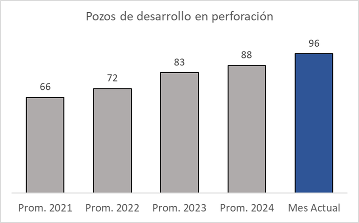 La comparación histórica refuerza esta tendencia: el número de pozos activos se ubica 50% por encima de febrero de 2020 y supera con amplitud los promedios anuales de 2021 (66 pozos), 2022 (72), 2023 (83) y 2024 (88).