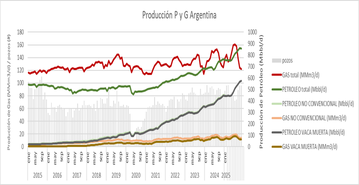 En el caso del gas no convencional, la producción fue de 76,6 millones de metros cúbicos diarios, equivalente al 62,6% del total, con estabilidad respecto del mes anterior y una leve baja interanual del 0,5%, aunque se mantiene muy por encima de los niveles históricos.