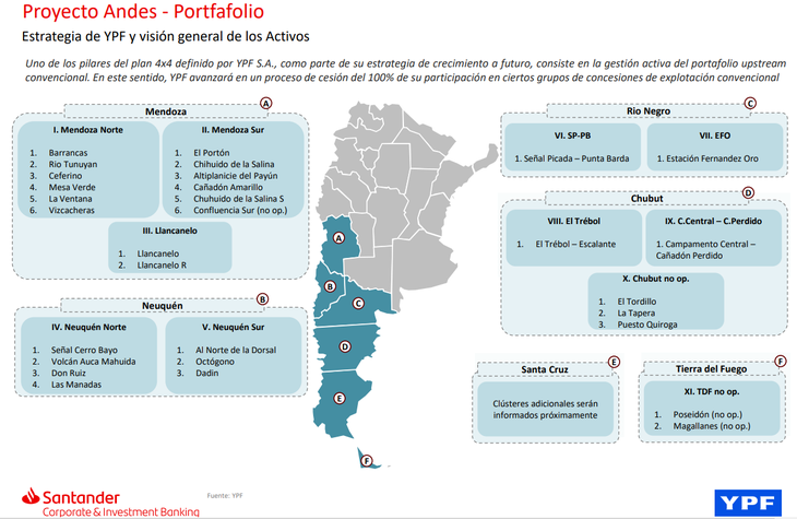 Para lograr un mejor resultado, las áreas convencionales se agruparon en diferentes clusters que comprenden seis provincias petroleras. La compañía designó al Banco Santander como encargado de la gestión de este proceso.