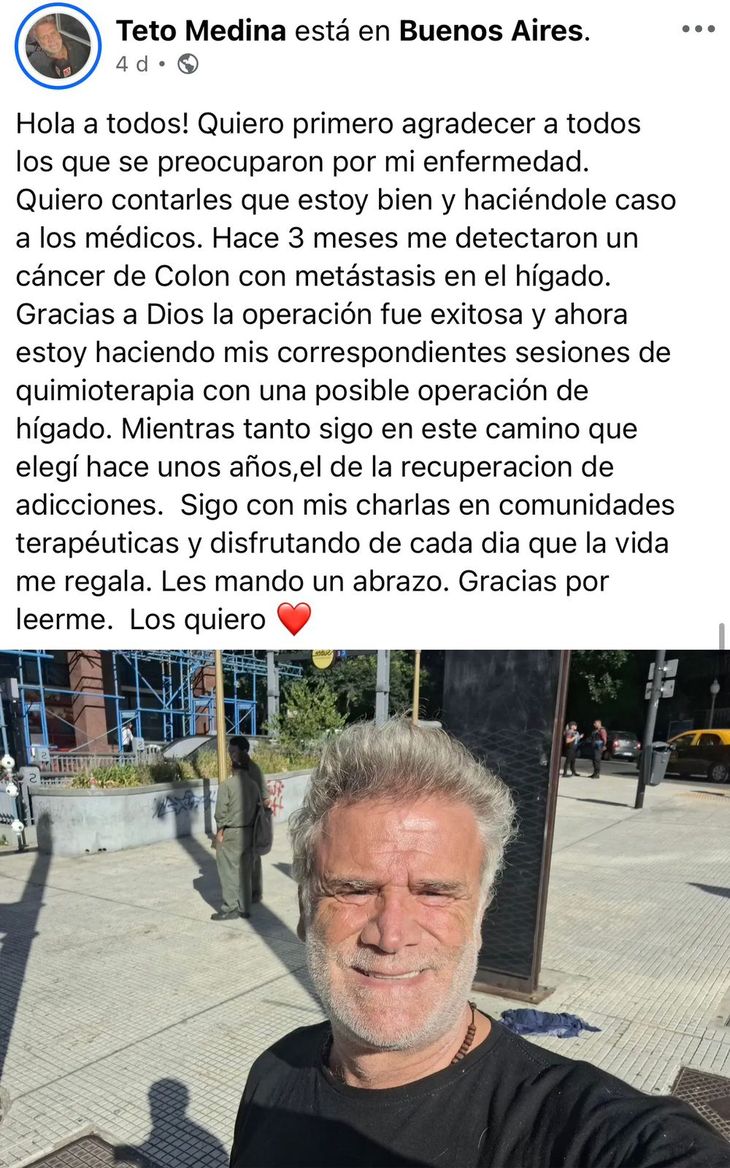 Con 60 años, decidió compartir personalmente la noticia con sus más de 160.000 seguidores en Facebook, agradeciendo el apoyo recibido y detallando los pasos de su tratamiento que, después de una cirugía inicial considerada exitosa, los médicos evalúan la posibilidad de una nueva operación.