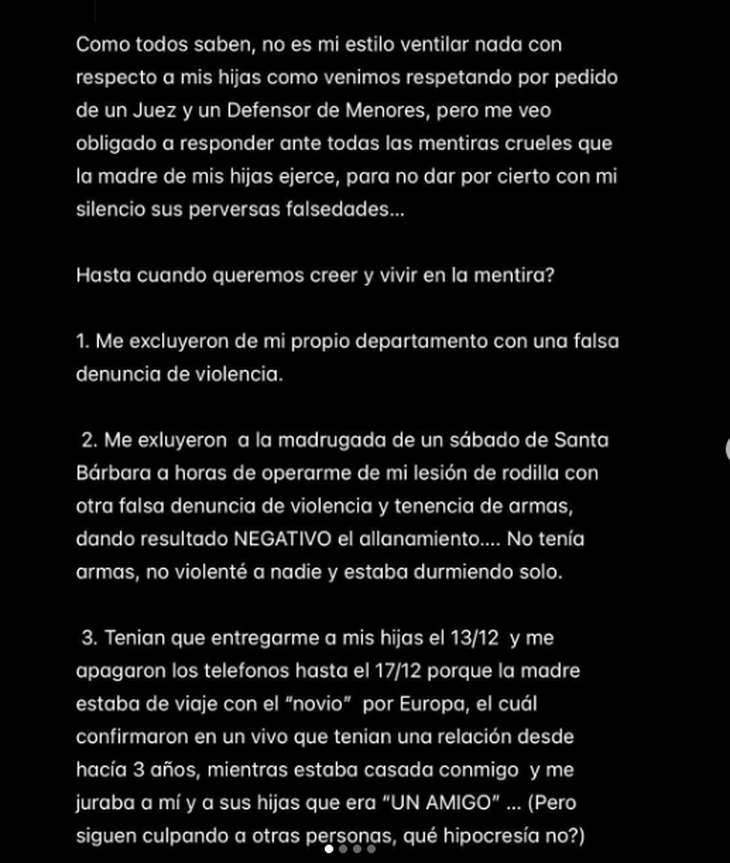 Finalmente, el jugador remarcó que “cada cosa que digo y publico lo hago obligado por las mentiras y difamaciones que ejerce la madre de mis hijas, sin importarle el bienestar y la salud mental de las mismas. Me duele en el alma saber que están siendo manipuladas psicológicamente por su madre. Pero confío en la Justicia. Estoy seguro que voy por el buen camino, me llevaron a la justicia y quisieron ensuciarme, pero con la Verdad, siempre salimos Victoriosos”, concluyó.