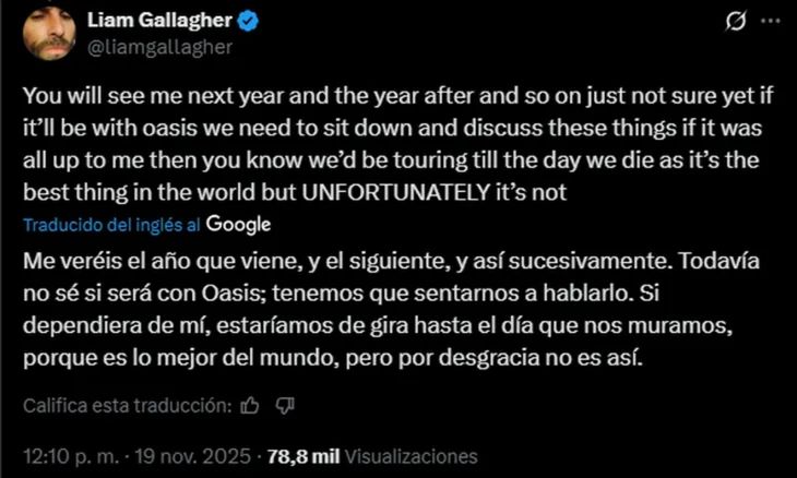 Como es habitual, Gallagher utilizó su perfil en X para compartir pensamientos, guiños musicales y adelantos de su vida personal y artística. Esta vez, sus palabras tomaron otra dimensión: “Inminente gran anuncio”, escribió, provocando una ola inmediata de reacciones, teorías y emociones entre quienes sueñan con un regreso a gran escala de Oasis.