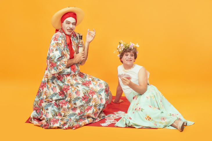 M.M.: En La Moribunda, la muerte y la risa bailan una danza. El código grotesco está presente en todos los lenguajes que se entrecruzan en la puesta: las actuaciones desopilantes de Darío Serantes y Juan Rutkus no permiten salir del teatro sin estar una hora a pura carcajada y también con lágrimas en los ojos por la sensibilidad y ternura que despierta la poética de la propuesta del texto. Eso es La Moribunda: la contradicción misma entre la tragedia y la comedia en la vida cotidiana de todos; o más bien, la comedia como manera para transitar lo trágico de las circunstancias inherentes al ser humano. Ese es el corazón del proyecto y mi propuesta fundamental desde la dirección. Hay una propuesta de código de actuación durante la teatralización que se desarrolla en las escenas de ficción - cuando las hermanas inventan estar en una playa en San Bernardo o le arman una fiesta de cumpleaños a su hermana moribunda con invitados como Coco Channel y Marguerite Yourcenar-. Y en una segunda instancia, otro código de actuación que se propone durante las escenas más crudas de verdad-realidad en el que Kara sale al exterior con miedo e incertidumbre a buscar comida, etc. Quise resaltar, desde la puesta, esta estructura dramática sugerida como en “picos”: cada vez que la fantasía de las hermanas está en alza, hay un factor de la realidad que “las baja a tierra”.