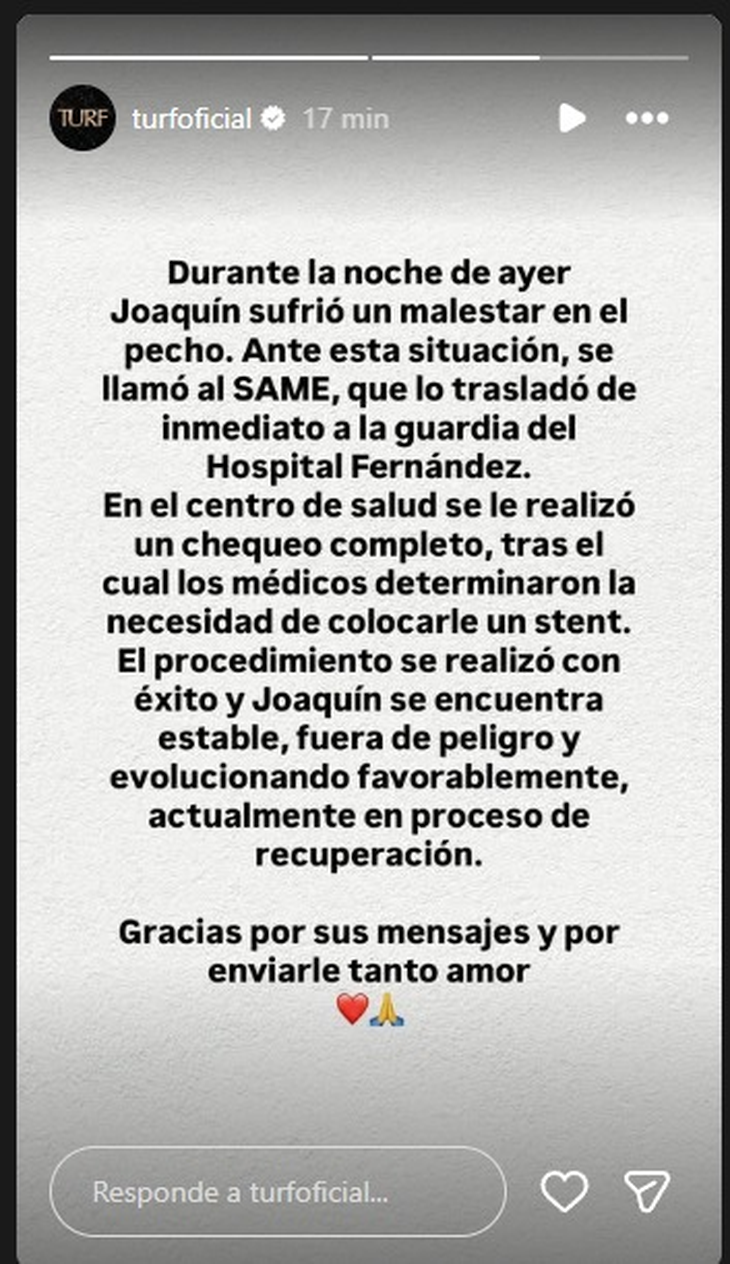 "Durante la noche de ayer Joaquín sufrió un malestar en el pecho. Ante esta situación, se llamó al SAME, que lo trasladó inmediatamente al Hospital Fernández. En el centro de salud se le realizó un chequeó completo, tras lo cuál los médicos determinaron la necesidad de colocarle un stent. El procedimiento se realizó con éxito y Joaquín se encuentra estable, fuera de peligro y evolucionando favorablemente, actualmente en proceso de recuperación. Gracias por sus mensajes y por enviarle tanto amor".
