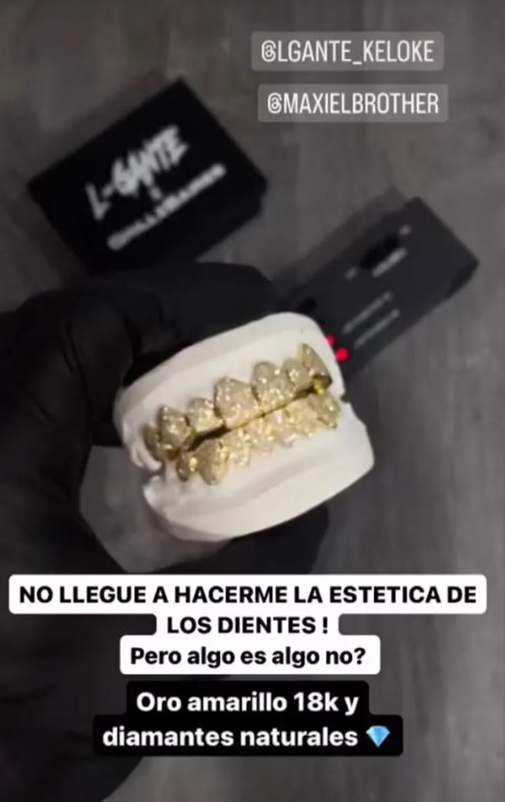 En las últimas horas L-Gante sorprendió a sus seguidores al mostrar una nueva adquisición de lujo: una pieza dental similar a una dentadura postiza realizada en oro amarillo de 18 kilates, con apliques de diamantes naturales.