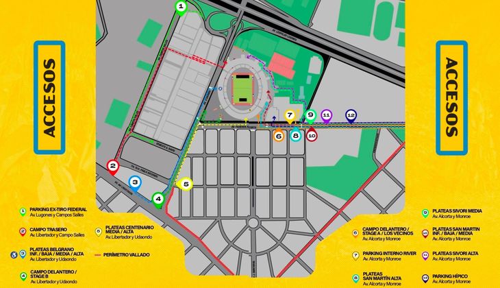 - Plateas Belgrano (todas las ubicaciones), Campo delantero Stage B y Plateas Centenario: acceso por Avenida Libertador y Udaondo.