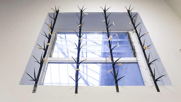 Uno de los puntos de inflexión del recorrido fue Reductos de la inmensidad I (2025), un cuerpo volador híbrido -a medio camino entre barrilete, ave y objeto- que se erguía en el punto más alto de la sala, atravesado por una flecha. La pieza condensó una sensación de detención y anhelo, como si el movimiento quedara suspendido en un instante de gracia. Más adelante, Despedida (2025) propuso una mirada cenital: un cielo frágil, liviano, que confrontaba al visitante con la precariedad de su propia representación y detenía el paso en un gesto contemplativo.
