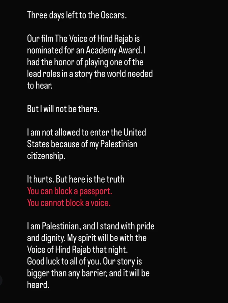 "Tuve el honor de interpretar uno de los papeles principales en una historia que el mundo necesitaba escuchar. Pero no estaré allí. No me permiten entrar a Estados Unidos debido a mi ciudadanía palestina", escribió Malhees en su publicación.