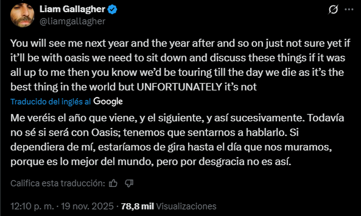 "Me verán el año que viene, y el siguiente, y así sucesivamente. Todavía no sé si será con Oasis; tenemos que sentarnos a hablarlo. Si dependiera de mí, estaríamos de gira hasta el día que nos muramos, porque es lo mejor del mundo, pero por desgracia no es así", afirmó Liam ante la consulta de un usuario.