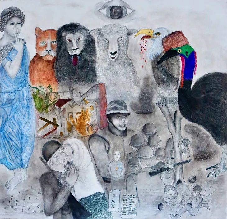 En “Un grito por la paz” se abre un ojo superior, el de Dios, que observa una composición gobernada por animales que encarnan a los líderes políticos, figuras que manejan los hilos de la violencia y deciden sobre la vida y la muerte. Son fácilmente reconocibles. A un lado, una figura pensativa representa a las Naciones Unidas, impotente, casi decorativa. Debajo, madres y esposas desgarradas, un soldado que no entiende lo que ocurre, y al fondo una fila de combatientes que marchan a la guerra. El árbol muerto al que otro soldado se aferra proviene de una fotografía real, en Ucrania, mientras las tumbas anónimas recuerdan que la muerte no distingue bandos. Inclusive aparece un casuario, el ave más letal del mundo