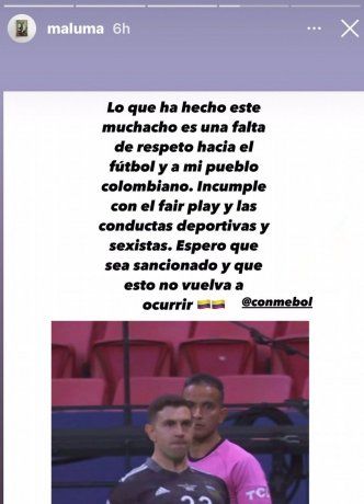 En su cuenta de Instagram, el autor del éxito "Felices los cuatro" apuntó contra el argentino y pidió que lo sancionen al considerar que tuvo un gesto "provocador y sexista". "Lo que ha hecho este muchacho es una falta de respeto hacia el fútbol y a mi pueblo colombiano. Incumple con el fair play y las conductas deportivas y sexistas. Espero que sea sancionado y que esto no vuelva a ocurrir", manifestó y además arrobó a la Confederación Sudamericana de Fútbol (Conmebol) para que vea el mensaje.