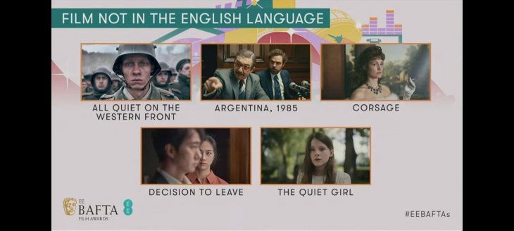 "Argentina, 1985" competirá por el galardón a la Mejor Película de habla no inglesa con "Sin novedad en el frente" (Alemania), de Edward Berger; "Decision to Leave" (Corea del Sur), de Park Chan-wook; "Corsage" (Austria) de Marie Kreutzer y "The Quiet Girl" (Irlanda) de Colm Bairéad.