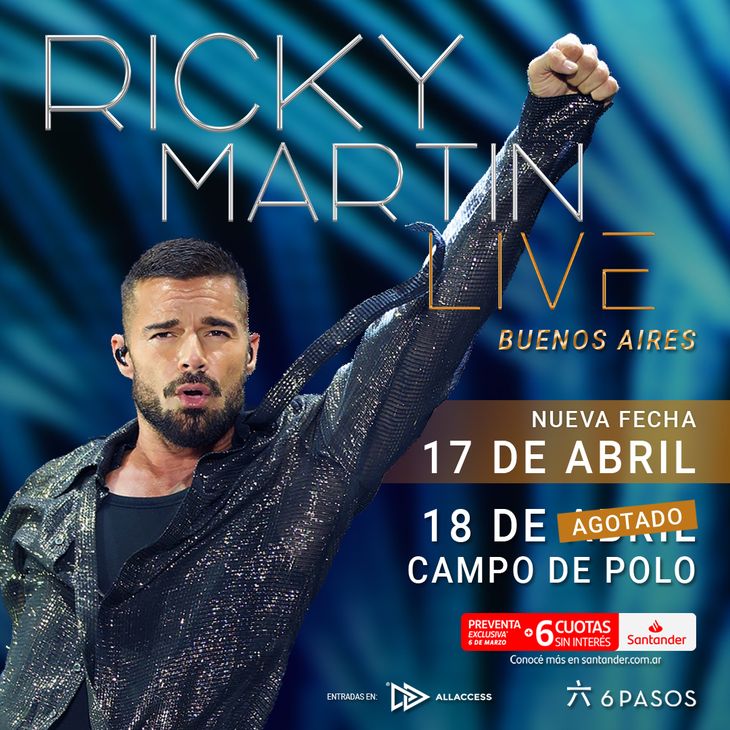 El cantante Ricky Martin agotó en pocas horas las entradas para su show del 18 de abril en el Campo Argentino de Polo y anunció una segunda fecha en Buenos Aires, que se realizará el 17 de abril.