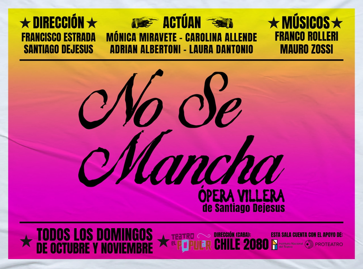 Podés adquirir tus entradas con descuentos (2x1, jubilados/as, estudiantes, docentes CABA, afiliados/as a UPCN, personas con discapacidades y vecinos/as del teatro), ingresando al siguiente link: http://www.alternativateatral.com/obra80636-no-se-mancha-opera-villera