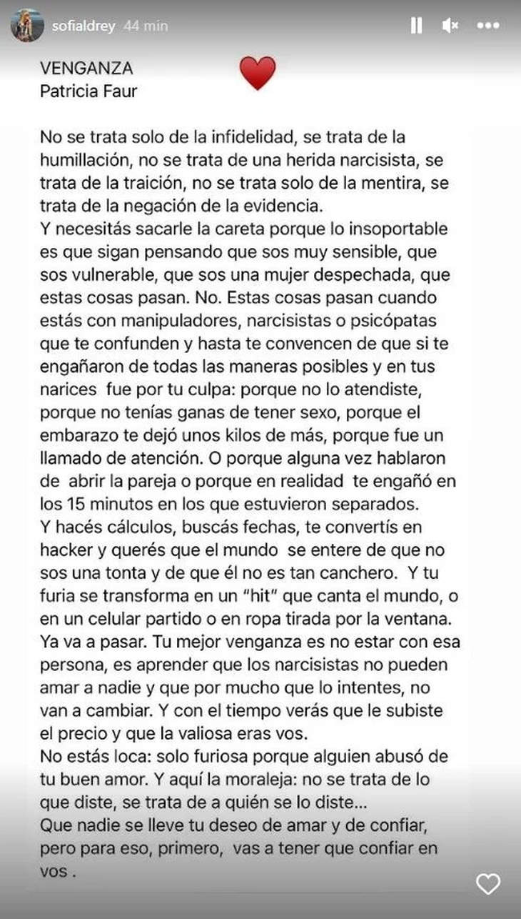 Por su parte, Sofía Aldrey también recurrió a las redes para compartir un picante texto de Patricia Faur llamado Venganza: "No se trata solo de la infidelidad, se trata de la humillación, no se trata de una herida narcisista. Se trata de la traición, no se trata solo de la mentira, se trata de la negación de la evidencia", dice parte del texto.