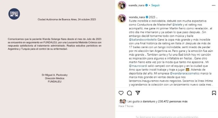 A través de su cuenta de Instagram, Wanda realizó un recorrido de su año: “2023 fuiste increíble e inolvidable, debuté con mucha expectativa como conductora. Me gané mi primer Martín Fierro como revelación, al otro día me internaron y ya saben lo que paso después”.