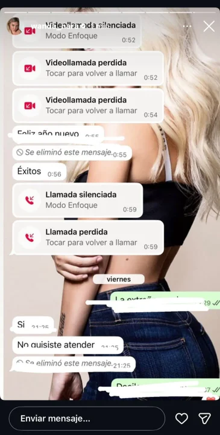 El segundo intento de comunicación habría sido en Año Nuevo, con mensajes eliminados, tres videollamadas y dos llamadas perdidas. “Feliz año nuevo. Éxitos”, escribió Icardi, donde luego le reclama que “no quiso atender”.