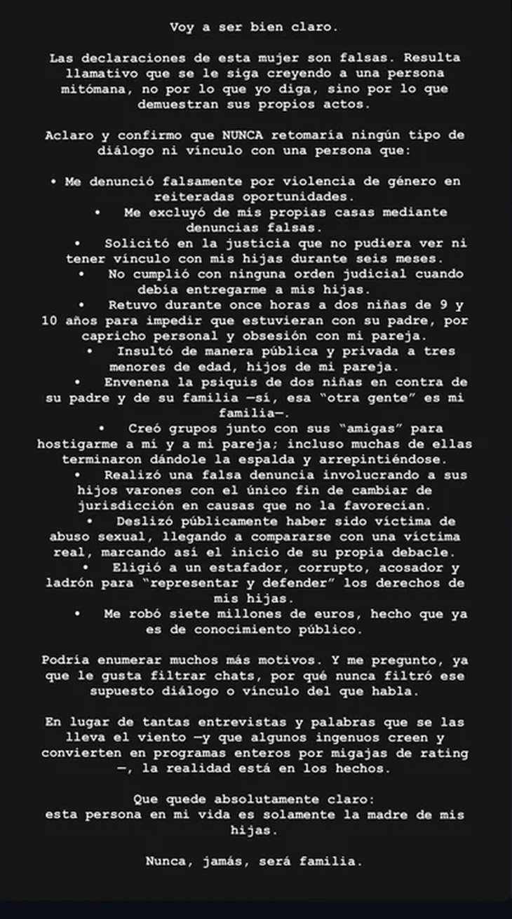 Cerrando cualquier puerta a la reconciliación, sentenció: “Que quede absolutamente claro: esta persona en mi vida es solamente la madre de mis hijas. Nunca, jamás, será familia”.