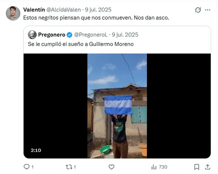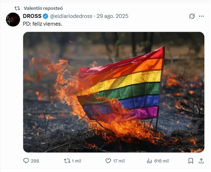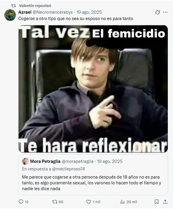 Entre los mensajes que trascendieron aparecen expresiones ofensivas contra personas migrantes y comentarios despectivos sobre diversidad sexual. También se viralizaron retuits y memes con referencias violentas hacia las mujeres, algunos de ellos vinculados directamente a la problemática del femicidio, lo que profundizó el repudio en torno a su figura luego del crimen.