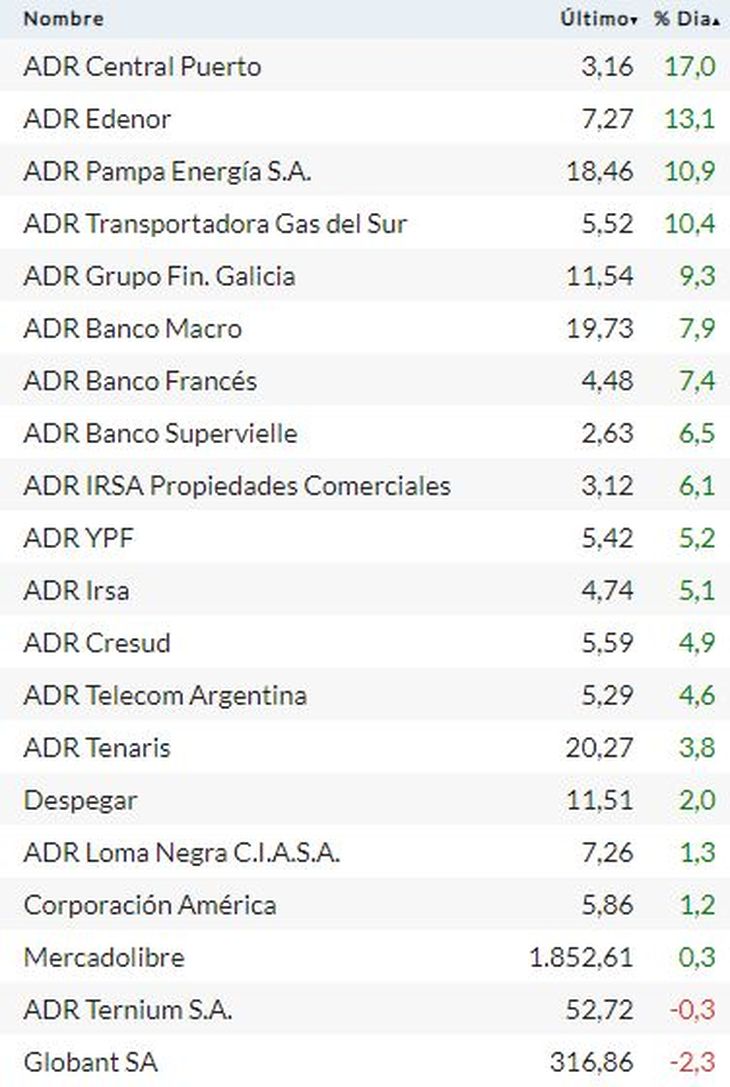 En la bolsa de Nueva York, las subas de los papeles argentinos fueron lideradas por Central Puerto (+17%); Edenor (+13,1%); Pampa Energía (+10,9%); Transportadora de Gas del Sur (+10,4%); Grupo Financiero Galicia (+9,3%); y Banco Macro (+7,9%).