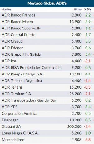 Por el contrario, lideraron los retrocesos del día Yamana Gold (-4,1%); Mercado Libre (-4%); y Globant (-2,8%).