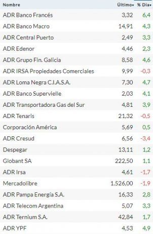 Después de trepar hasta 9% el viernes, cuando el mercado local no operó por el feriado por el Día de la Independencia, los ADRs de empresas argentinas redoblaron la apuesta, y volvieron a ser demandados, anotando alzas de hasta casi 7%, de la mano del sector financiero. El podio del día lo integraron: el banco BBVA (+6,4%); YPF (+4,9%); y Loma Negra (+4,7%).