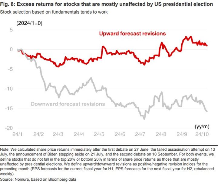 No obstante, los principales indicadores del país cerraron en rojo, con lo que la reacción del mercado refleja que las autoridades enfrentan un desafío considerable para cumplir con las expectativas de los inversores y revitalizar un repunte económico que se está debilitando. Pues el escepticismo va en aumento, ya que Pekín parece evitar lanzar un estímulo fiscal que esté a la altura de la sorpresa provocada por la intervención del banco central a finales de septiembre. Así, la conferencia de prensa de este jueves fue vista como otra decepción por parte de los inversores. Pero para Nomura "curiosamente, hay implicaciones para las acciones relacionadas con China y una posible victoria de Trump".