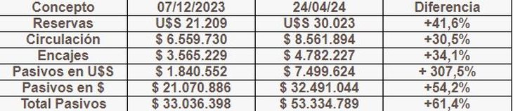 En cuanto al pasivo del Banco Central, la circulación monetaria creció el 30,5%, mientras que la inflación medida en igual período podría ubicarse en torno del 100% (no tenemos la inflación de abril aún), el dólar mayorista en igual período aumento el 139,6%.