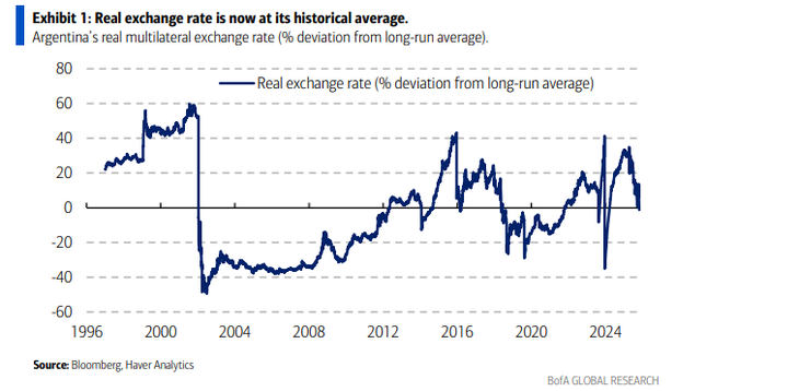 Según su análisis, "el tipo de cambio real de Argentina está menos sobrevaluado de lo que el mercado percibe en general. Actualmente, el tipo de cambio real se encuentra cerca de su promedio histórico y alineado con nuestra estimación de equilibrio".