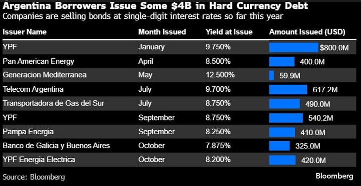 Y es que empresas como YPF, Pan American Energy, Generación Mediterránea, Telecom Argentina, Pampa Energía y Banco Galicia colocaron más de u$s4.000 millones (u$s4.062,3 millones) en el mercado internacional. En tanto, algunas como San Miguel, GEMSA, Celulosa Argentina, Aluar e IRSA (y también algunas de las mencionadas antes) hicieron lo propio en el mercado local.