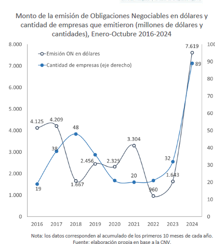 Entre enero y octubre de 2024, la emisión bruta de ONs alcanzó los u$s7.619 millones. En comparación, los montos registrados en 2016 y 2017 fueron de u$s4.125 y u$s4.209 millones (total de u$s8.334 millones en esos dos años), respectivamente, evidenciando una expansión significativa. Así lo destaca un informe reciente elaborado por CIFRA.