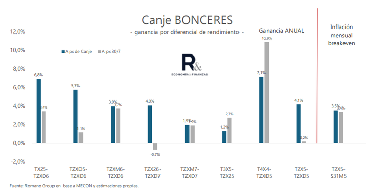 Un informe de la consultora Romano Group, a partir de las cotizaciones del mercado secundario y del valor técnico al que se toman los títulos elegibles, calculó que la oferta presenta “cierta prima” por sobre el valor de mercado para quienes decidan participar de la conversión. La “ganancia por precio” estimada por la firma promedia el 0,56%. “Si bien por alargar duration se obtiene un rendimiento promedio del 5%, dicho rendimiento también puede obtenerse en el mercado debido a cómo cotiza la curva (a precios del 30 de julio dicho rendimiento promedia el 3%)”, agregó el reporte elaborado para sus clientes.