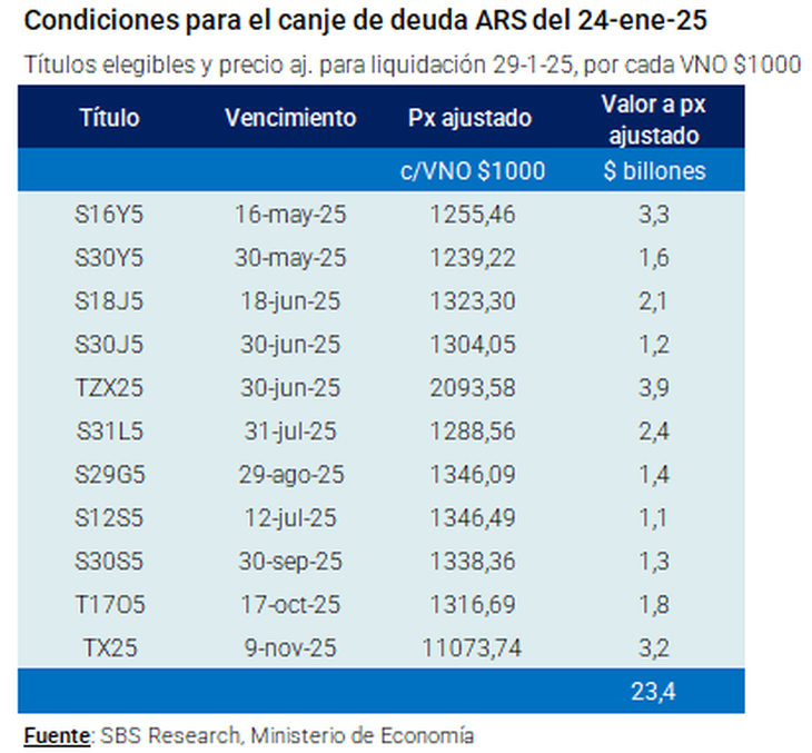 La operación se realizará este viernes y será de una importante magnitud. Los instrumentos elegibles para participar de la conversión aglutinan vencimientos por alrededor de $23 billones, según cálculos privados. Portfolio Personal Inversiones (PPI) calculó que representan el 20,5% de los compromisos en moneda local pautados para todo 2025. Como incentivo para que los tenedores entren al canje, la Secretaría de Finanzas reconocerá un precio superior al que se pagó por esos instrumentos en las últimas ruedas en el mercado secundario. En la city, ven atractivo el “premio” y auguran un elevado nivel de adhesión.