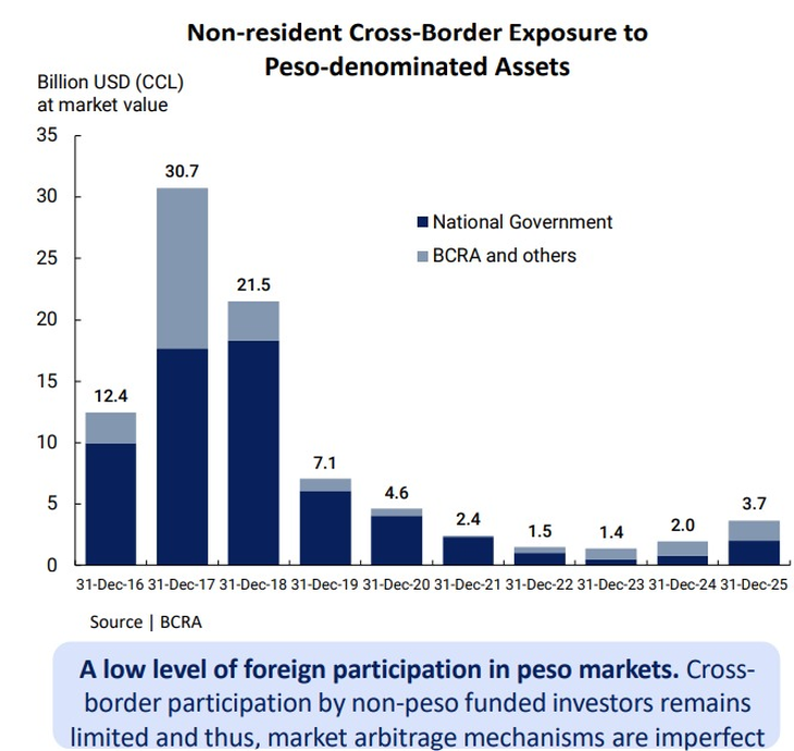Werning realizó un diagnóstico sobre el bajo nivel de participación extrajera en el mercado de pesos. "La participación transfronteriza de inversores no fondeados en pesos sigue siendo limitada y, por lo tanto, los mecanismos de arbitraje de mercado son imperfectos". En concreto, el informe muestra que a fines de 2025 los capitales extranjeros posicionados en activos en pesos alcanzó los u$s3.700 millones. Esto implicó un importante incremento respecto de los u$s2.000 millones de 2024 y el piso de u$s1.400 millones, pero sigue muy lejos de los u$s30.700 millones de 2017, antes del inicio de la crisis que vivió el gobierno de Mauricio Macri.