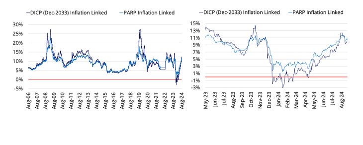 “Los rendimientos de bonos largos ajustables por CER aún se encuentran muy por arriba de rendimientos históricos”, señala el documento. Y agrega que: el spread entre un bono dollar linked (TV25 - 11,6%) y uno CER (T2X5 +4,6%) se redujo la última semana, pero sigue estando cercano a máximos. “El mercado estaría viendo una depreciación del tipo de cambio 16% arriba de la inflación de aquí a marzo de 2025”, advierte.