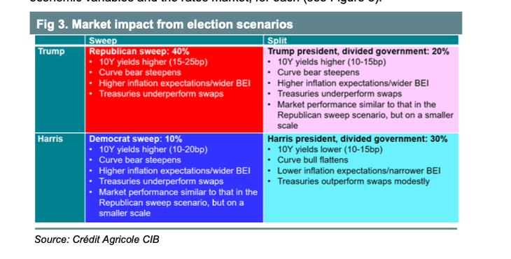 Sobre el impacto de una barrida republicana en el mercado financiero, el banco francés proyecta un aumento en los rendimientos de los bonos del Tesoro, en especial los de a 10 años, aunque se espera que mayores expectativas inflacionarias impactarán en esas tasas de ganancia.