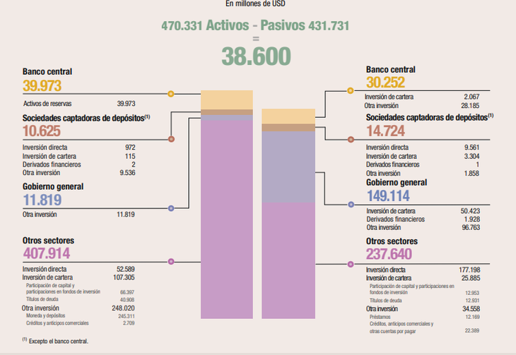 En lo que corresponde a la posición de inversión internacional neta, los activos sumaron en el segundo trimestre un total de u$s470.331 millones mientras que los pasivos sumaron u$s431.731 millones, de lo que quedó un saldo a favor de u$s38.600 millones.