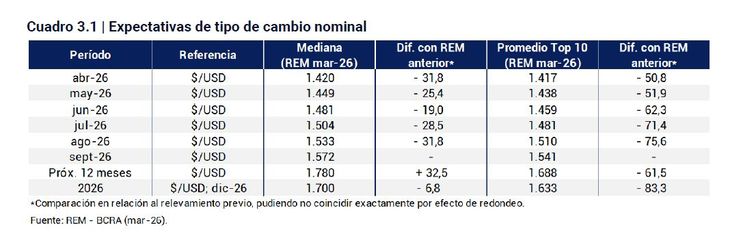 De acuerdo con el informe, la mediana de las proyecciones ubicó al dólar mayorista en $1.420 para el promedio de abril de 2026, lo que implica un recorte de $32 frente al REM anterior. El relevamiento surge de las estimaciones realizadas por consultoras, bancos y centros de investigación que participan del relevamiento mensual del BCRA.