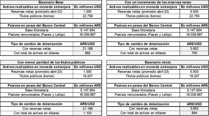 De este modo, se proponen cuatro escenarios de análisis. El primero considera la situación actual, en base a los stocks de reservas internacionales y bonos en moneda extranjera que posee el Banco Central vs. el total de sus pasivos en pesos. Luego, se detallan dos escenarios en el que se contempla cuánto sería el tipo de cambio de dolarización en caso de que las reservas netas se ubiquen en niveles similares a los de finales de 2022, y otro que hace lo propio en el caso de que los títulos públicos coticen a una paridad inferior (20%) similar a valores de finales de 2022 como consecuencia de un exceso de oferta ante la necesidad de liquidar las posiciones para hacerse de dólares. Por último, se propone un escenario mixto que integra ambas variantes de los escenarios 2 y 3.