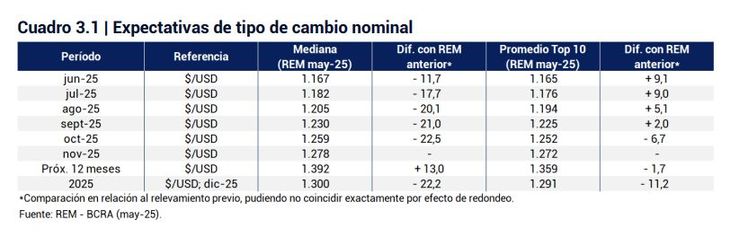 Según el REM de mayo, los analistas proyectan un sendero de subas muy moderadas para el dólar oficial en los próximos meses, de entre el 1,3% (julio) y el 2,4% (octubre). Así, la mediana de las expectativas ubica al tipo de cambio en $1.182 para julio, $1.205 para agosto, $1.230 para septiembre, $1.259 para octubre y $1.278 para noviembre.