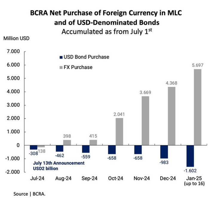 El 20 de enero, el vicepresidente del BCRA, Vladimir Werning, realizó una presentación en Londres titulada “Programa Económico de la Argentina (Etapa 3): la Estabilidad Interna (menores stocks monetarios y equilibrio fiscal) provee una base sólida para construir Flexibilidad Externa (mayores stocks de divisas y equilibrio de balanza de pagos)” durante la 11va Conferencia Latinoamericana organizada por BBVA. En su exposición, un gráfico reveló que la venta de bonos en dólares para intervenir en el mercado financiero ha aumentado considerablemente: en diciembre se registraron ventas por USD 325 millones, mientras que en los primeros 16 días de enero estas alcanzaron USD 619 millones, convirtiendo a enero en el mes con mayor intervención desde el inicio de esta etapa.