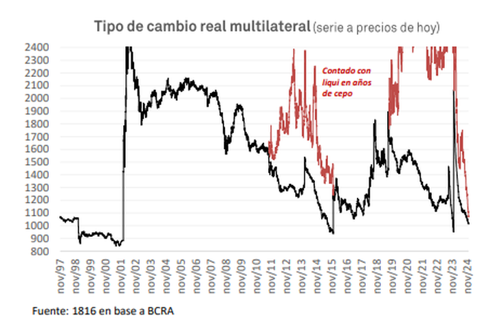 La referencia de Furiase al margen para apreciar no es casual. Ocurre que, tras la megadevaluación de diciembre de 2023, la tablita del 2% mensual que mantuvo el BCRA (siempre por debajo de la inflación) y la devaluación de varios socios comerciales claves (como Brasil) se comió casi la totalidad del efecto cambiario de esa depreciación. Así, el tipo de cambio real multilateral ya es prácticamente igual al que había cuando asumió Milei, uno de los más apreciados desde la salida de la convertibilidad.