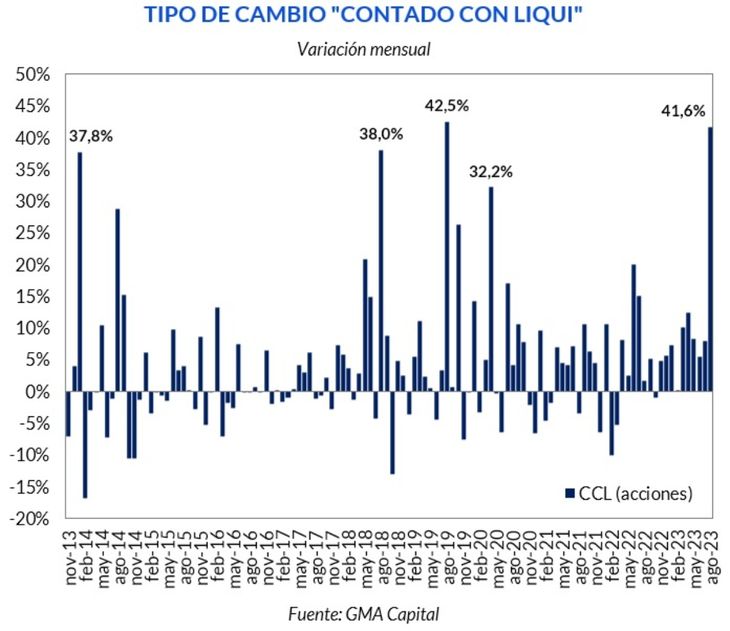 El dólar "Contado con Liquidación"(CCL) -que usan las empresas para girar divisas al exterior- saltó 40,6% en agosto y anotó su avance mensual más importante desde agosto de 2019 (cuando subió 42,5%), en un mes atravesado por las elecciones PASO -donde el candidato más votado fue sorpresivamente Javier Milei- y la devaluación del 20% del peso, que hizo disparar la inflación,