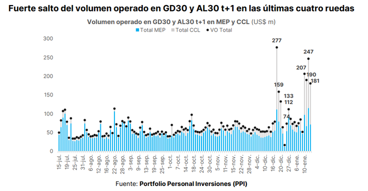 Aún sin datos monetarios que lo clarifiquen, PPI señaló que el volumen operado en los bonos GD30 y AL30 continuó en niveles “atípicamente elevados” esta semana. Si el viernes fue de u$s207 millones (en las ruedas previas promedió los u$s72 millones), este lunes fue de u$s190 millones, el martes de u$s247 millones y el miércoles de u$s181 millones. “Esto nos hace pensar que la intervención podría haber sido similar a la del viernes”, señaló la firma en el reporte diario para sus clientes y estimó que entre las cuatro ruedas el BCRA habría destinado unos u$s250 millones.