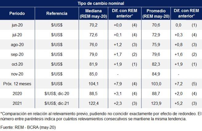 De acuerdo al Relevamiento de Expectativas de Mercado (REM) realizado por el Banco Central (BCRA) en el mes de mayo, el tipo de cambio nominal mayorista promedio esperado para fines de junio se ubica en $70,20, mientras que el nivel proyectado para diciembre es de $88,50, con lo que la variación nominal prevista para 2020 es del 47,7% interanual.
