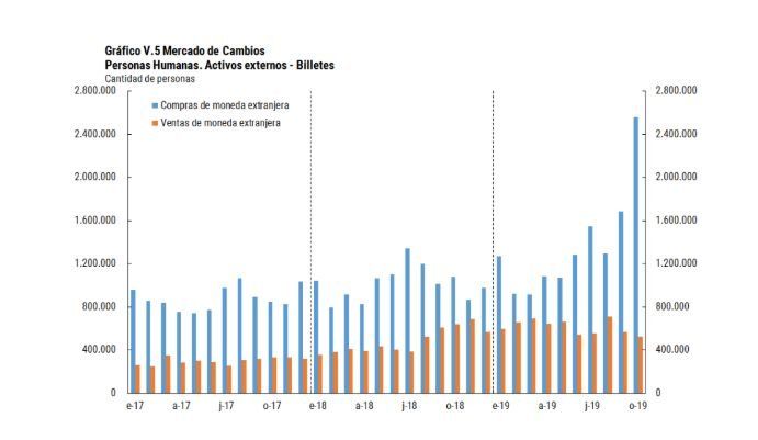 A su vez, "la cantidad de individuos que compró billetes a través del mercado de cambios fue de 2.556.000 personas en octubre, mientras que la cantidad de individuos que vendió billetes en el mismo totalizó 524.000 personas", agregó.