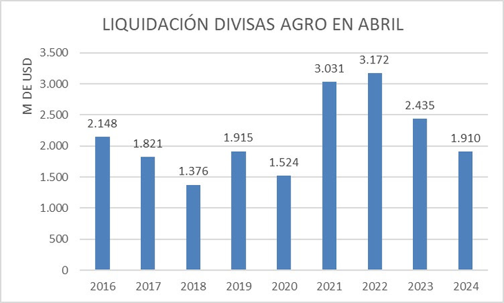 Durante abril las empresas del agro liquidaron u$s1.910 millones, esto representa una retracción de 21,5% frente al mismo mes del año pasado, de acuerdo con datos de la Cámara de la Industria Aceitera (CIARA) y el Centro de Exportadores de Cereales (CEC). "Pero hay que destacar que respecto de marzo las liquidaciones aumentaron 27%. Y, en relación al primer trimestre de 2023, la mejora fue de 23%", explicaron desde Wise Capital.
