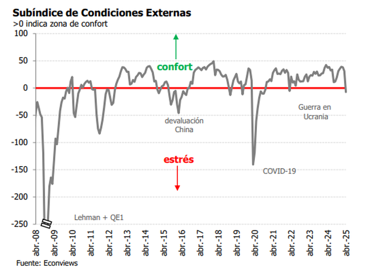 Las condiciones financieras externas entraron en zona de estrés por primera vez desde marzo de 2022, cuando se desató la guerra entre Rusia y Ucrania. En esta ocasión el evento disruptivo fue el boom de aranceles que decidió aplicar al resto del mundo el presidente de los Estados Unidos, Donald Trump.