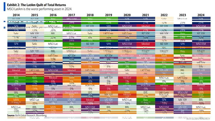 La posición del BofA sobre la Argentina es llamativa, pues analiza que la demanda por acciones en América Latina es baja. Y advierte que "las tasas más altas en EEUU y un dólar más fuerte son los mayores riesgos para la región". El índice MSCI LatAm acumula una caída del -18% en lo que va del año, en comparación con un aumento del +25% para el S&P500 y +11% para los mercados emergentes. "El principal lastre en América Latina fue el tipo de cambio de México (-16%) y el de Brasil (-15%)".